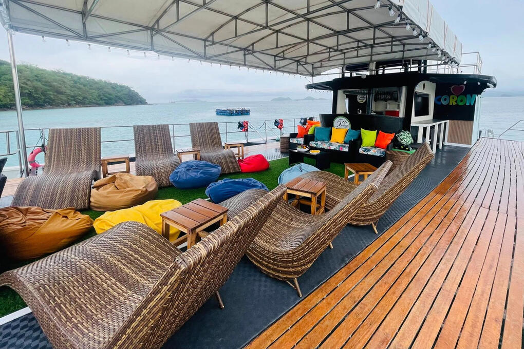 At Cinco Niños, we take pride in offering a comfortable and relaxing experience aboard our 85ft trimaran. Enjoy expansive open spaces, including our inviting lounge area with plush couches, hammocks, beanbags, and lounge chairs. The upper deck provides a full panoramic view of Coron’s crystal-clear waters and stunning islands, perfect for soaking in the scenery.Exclusive to Cinco Niños, we offer a private chef to prepare meals tailored to your tastes, a fully stocked cash bar with expert bartenders, and on-demand massage therapists to enhance your relaxation. Our crew includes fully licensed tour guides and captains, ensuring your safety and a seamless journey. For added convenience, we also provide a restroom and shower on board.At Cinco Niños, we’ve thought of every detail to ensure your time with us is nothing short of extraordinary.